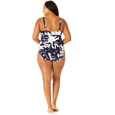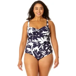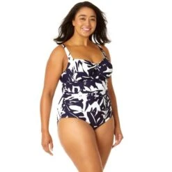 Our Plus Size Retro Twist Front Shirred One Piece Swimsuit is part of the Coastal Palm collection, which features a navy and white tropical pattern. This one piece swimsuit has a twist front detail, shirring, and removable cups to add comfort and style to your summer look. Pair this one piece swimsuit with our Button Down Shirt Swimsuit Cover Up for a breezy beach day look!