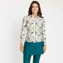 Delicately merging form and function, the Nora Swim Top is graced with long sleeves, perfect for those seeking additional coverage without compromising on style. The chic mock neckline is a defining feature, lending an air of sophistication to any beach or poolside ensemble. The full-zip closure, accompanied by a handy tab, not only ensures easy wear but also adds a touch of modern flair. Artfully incorporated side ruching creates a cinched appearance, ensuring every wearer feels both comfortable and confident. And when it comes to protection, the UPF 50+ offers a robust shield against the sun’s rays, while the quick-dry fabric promises a hassle-free transition from water activities to lounging. Step into the embrace of the Nora Swim Top and let Calypsa elevate your swimwear experience. Here, every stitch and detail are imbued with the promise of style, comfort, and self-assured elegance. Dive in, knowing you’re adorned in a piece that truly understands and celebrates you.