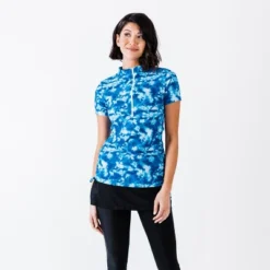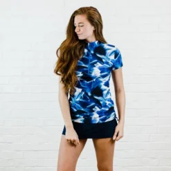 Discover the Half-zip Adele Swim Top, your new go-to for a day at the beach or by the pool. This tight-fit top features a modern mock neckline, short sleeves, and half-zip closure with a tab for adjustable comfort. Designed to be worn over your favorite swim bra, it offers flexibility and style. The side ruching not only adds a chic touch but also provides a flattering cinched look. Made from 82% nylon and 18% spandex, this top is quick to dry and comes with UPF 50+ sun protection. Effortlessly pair this top with the swim bottom of your choice, thanks to our mix & match collection.