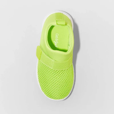 Equip your toddler for water activities in these Austen Slip-On Water Shoes from Cat & Jackā¢. These medium-width water shoes feature a closed toe and heel design for keeping their feet comfortable in water, and they feature a mesh upper to help water drain out quickly. The adjustable elastic strap with a hook-and-loop closure helps them find a customizable fit. Featuring a slip-on design, the water shoes feature a pull-on tab at the back for easy wear.