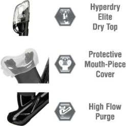 The USP-250 dry snorkel features TUSA Hyperdry Elite dry top technology (pat p) that stops water from entering into the snorkel, a drain chamber and purge valve for easy clearing, and silicone mouthpiece.