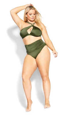 Ticking all the style boxes, meet our Alena Underwire Bikini Top in an opulent olive hue. Flaunting a fabulous asymmetrical intertwined halter neckline, gorgeous gold hardware and supportive underwire, this bikini top is destined to have all eyes on you! Make hearts race with Fox & Royal. Sure to indulge your deepest desires, this lingerie brand boasts decadent lace designs that are sure to turn up the heat in the bedroom. From lingerie sets to playwear, these curve-loving designs are sure to command attention. Available in sizes 14-32.