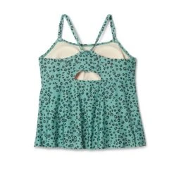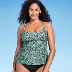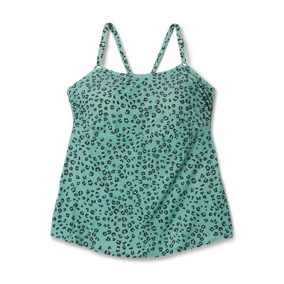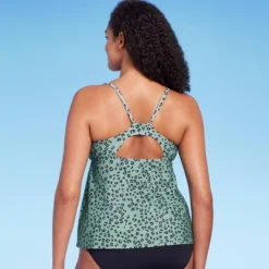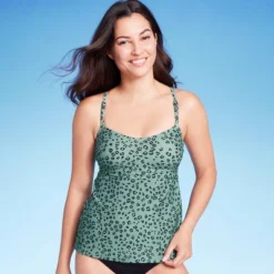 Hit the beach or pool in trendy style by wearing the Spotted Scoop Neck Tankini Top from Kona Sol™. This racerback-style tankini top is covered with animal print in green and black hues for an appealing look you’ll love showing off. Made with a mix of soft and stretchy fabric with partial lining, this moss green tankini top helps keep you comfortable throughout the watery fun, and comes with adjustable straps for added convenience. This scoop neck top comes with sewn-in cups for comfortable coverage. Simply pair it with an animal-print or solid-color swim bottom to create a complete, chic look.