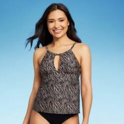Give your swimwear closet a stylish upgrade with this Zebra Print High-Neck Tankini Top from Kona Sol™. The sleeveless tankini top features a high neckline and an open back for a flattering look, and the fabric has an allover zebra print for a wild look. Sewn-in cups provide comfortable coverage, while the adjustable straps let you find the perfect fit. Crafted from lightweight fabric with added spandex for comfy wear, style this tankini top with the bikini bottom, boyshorts or swim skirt of your choice to create your own customized look.